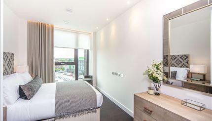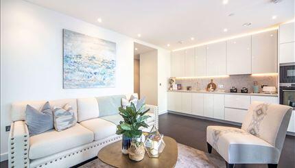 The apartment comprises a spacious reception room complete with Samsung Smart TV's with Bose sound bars incorporating a built in Amazon Alexa to control the apartments lighting, TV and heating systems along with a private winter garden creating a further living area. The reception room is open plan with a fully fitted kitchen featuring integrated AEG appliances with floor to ceiling windows providing far reaching views across London. The apartment offers two double-bedrooms, two-bathrooms, one of which is an en-suite bathroom from the master bedroom. The apartment also benefits from ample storage space.